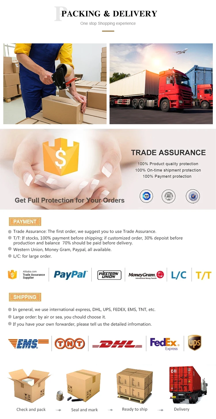 We accept wire transfers, PayPal, Western Union, and letters of credit. To start production, a 30% deposit is required, and the balance must be paid before the start